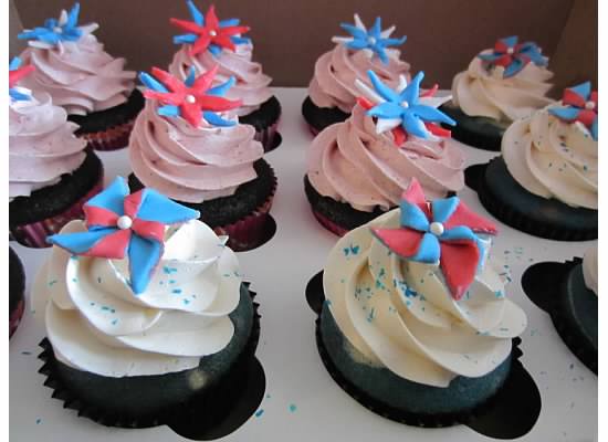 In addition to the cookies, I made two kinds of cupcakes because I like to spazz out on holidays and provide a lot of variety. I made a red,white, and blue velvet cupcake with vanilla Swiss meringue buttercream frosting and a fondant pinwheel topper.
